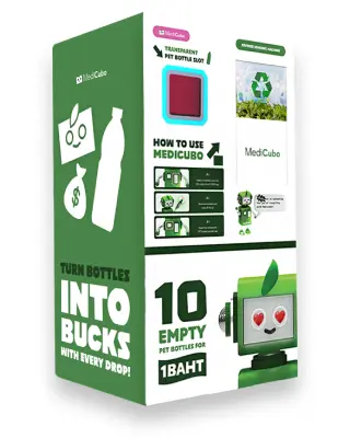 MediCubo is a system that innovatively improves PET bottle recycling, using the following mechanisms to secure high-quality flakes.